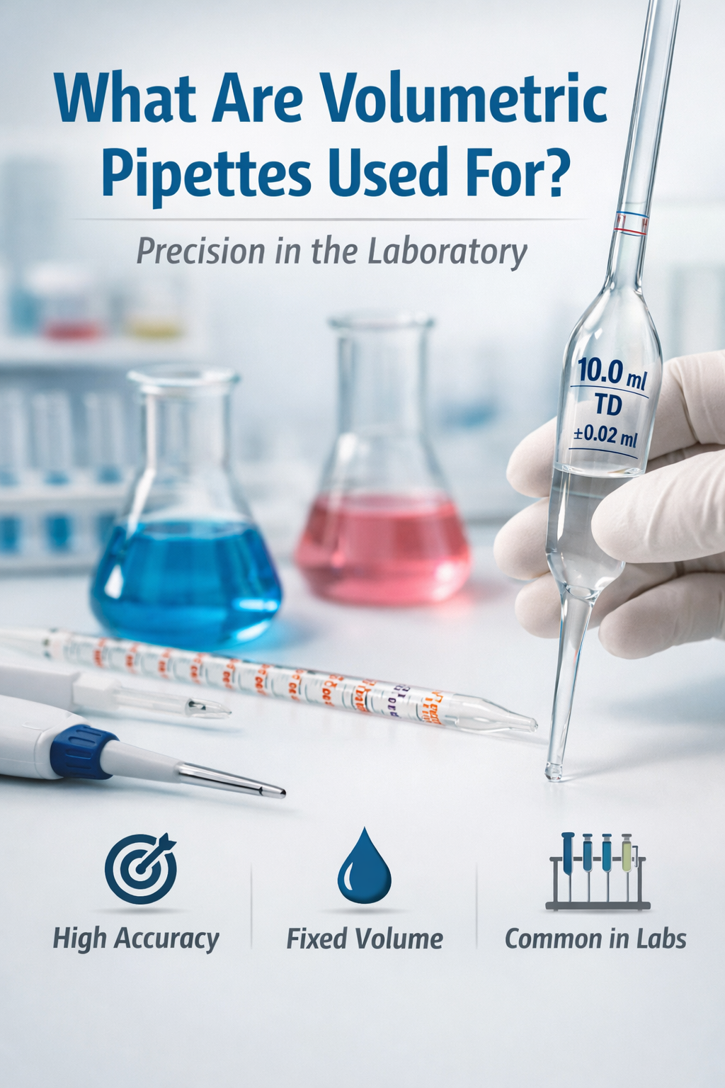Volumetric pipettes (also called bulb pipettes) are slender, highly calibrated instruments designed for extreme precision. They are commonly used in chemical analysis and in the study of chemical and biological properties. Their main advantage lies in their ability to deliver a precise volume of liquid with accuracy up to four significant figures, making them ideal for precise measurements.